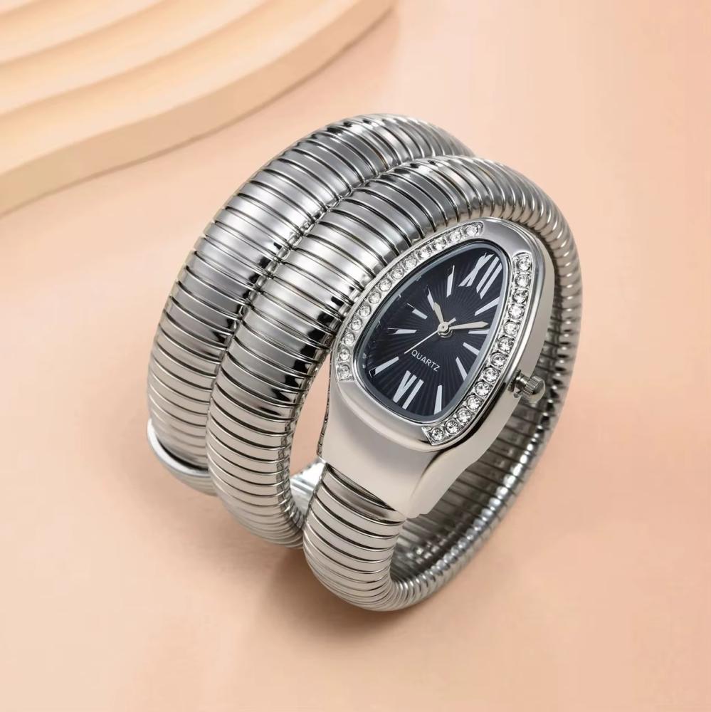 يأتي السوار مصممًا على شكل ثعبان ملتف، يُضفي لمسة فريدة وجذابة، بينما يُزيّن وجه الساعة بألماس صغير يلمع مع كل حركة. هذه الساعة ليست مجرد إكسسوار، بل هي تعبير عن ذوقك الجريء والراقي.